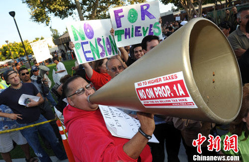 當?shù)貢r間7月26日傍晚,加州貝爾市近千名市民據(jù)記載市政廳門前,抗議該市官員領取六位數(shù)年薪,要求市長和市議員辭職。中新社發(fā) 張煒 攝