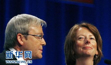 圖為2009年7月30日在澳大利亞悉尼拍攝的朱莉婭·吉拉德(右)和陸克文參加工黨會(huì)議的資料照片。 新華社/路透