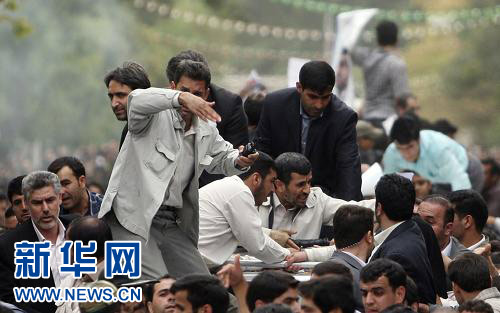 8月4日,在伊朗首都德黑蘭附近的哈馬丹,伊朗總統(tǒng)艾哈邁迪-內(nèi)賈德的保鏢在聽(tīng)到人群中發(fā)出的響聲后作出反應(yīng)。新華社/路透