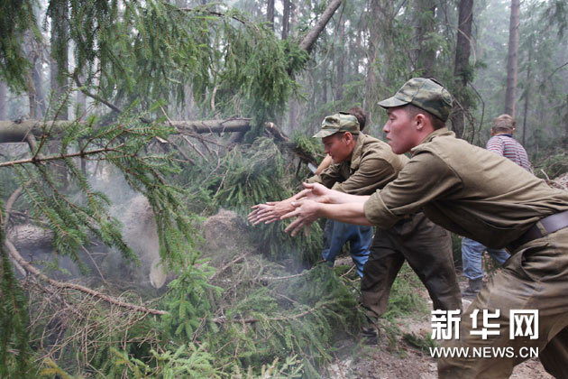 8月7日,在俄羅斯莫斯科州的奧列霍沃-祖耶沃村附近,士兵撲滅一處火點。新華社記者魯金博攝