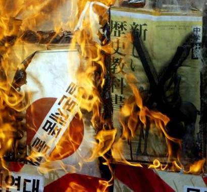 資料圖片:韓國(guó)抗議者在日本駐韓國(guó)大使館前燒毀日歪曲歷史教科書。