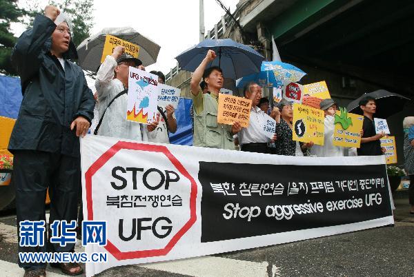 8月16日,韓國民眾在“韓美戰(zhàn)爭指揮中心”前舉行集會,呼吁和平,反對韓美舉行名為“乙支自由衛(wèi)士”的聯(lián)合軍事演習(xí)。 新華社發(fā)(樸真熙攝)