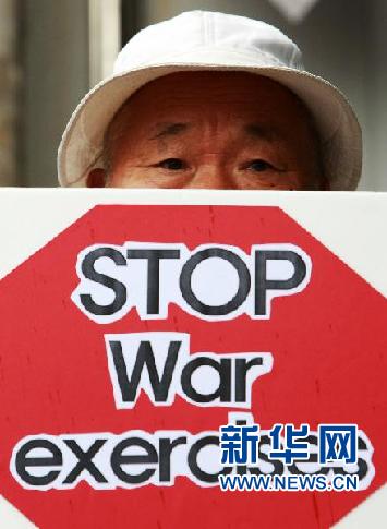 2010年8月16日 韓國(guó)民眾集會(huì)反對(duì)韓美聯(lián)合軍演 8月16日,韓國(guó)民眾在“韓美戰(zhàn)爭(zhēng)指揮中心”前舉行集會(huì),呼吁和平,反對(duì)韓美舉行名為“乙支自由衛(wèi)士”的聯(lián)合軍事演習(xí)。為期兩周的韓美2010年度“乙支自由衛(wèi)士”聯(lián)合軍事演習(xí)16日起在韓國(guó)境內(nèi)開始舉行。 新華社發(fā)(樸真熙攝)