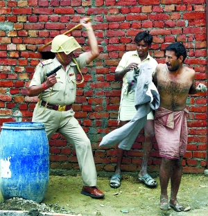 17日,印度阿格拉,一名警察右手拿槍,左手用手杖鞭笞示威農(nóng)民。