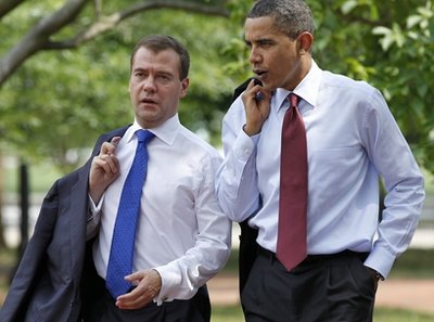 資料圖片:奧巴馬與梅德韋杰夫在華盛頓拉斐特公園散步。