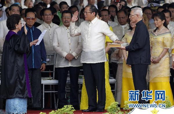 資料圖:6月30日,菲律賓當(dāng)選總統(tǒng)貝尼尼奧·阿基諾三世(中)在首都馬尼拉宣誓就職,成為菲律賓第15任總統(tǒng)。菲律賓當(dāng)日舉行新總統(tǒng)就職典禮,貝尼尼奧·阿基諾宣誓就任總統(tǒng)。新華社/路透