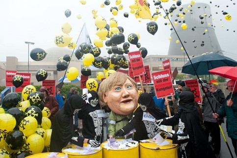 2010年8月26日,德國抗議者在核電站前戴著德國總理默克爾臉部肖像的面具,或者戴著骷髏面具表示抗議核能。