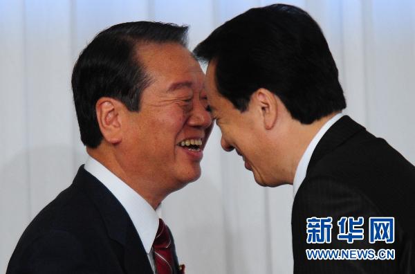 9月1日,在日本首都東京舉行的聯(lián)合記者會(huì)開(kāi)始前,日本首相、執(zhí)政的民主黨代表(黨首)菅直人(右)和民主黨前干事長(zhǎng)小澤一郎抵達(dá)會(huì)場(chǎng)。新華社記者季春鵬攝