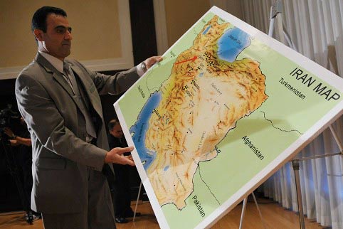 “人民圣戰(zhàn)者組織”發(fā)言人在新聞發(fā)布會現(xiàn)場展示核設(shè)施的衛(wèi)星圖片、標(biāo)明記號的地圖等。