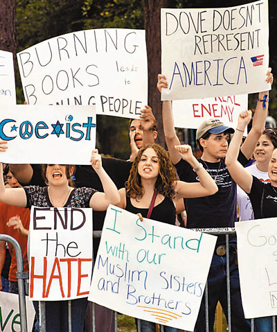 示威者在曾發(fā)起焚燒《古蘭經(jīng)》的牧師瓊斯的教會外抗議“燒經(jīng)”行為。