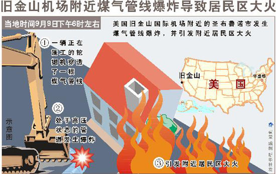 2010年9月10日 圖表:舊金山機(jī)場(chǎng)附近煤氣管線爆炸導(dǎo)致居民區(qū)大火 新華社發(fā)