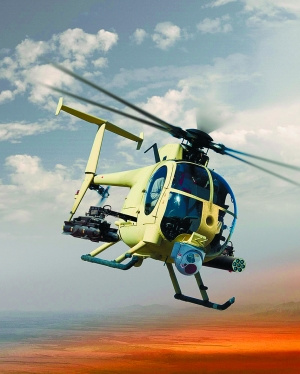 AH-6,機(jī)長(zhǎng):9.9米 旋翼直徑:8.3米;起飛重量:1.6噸;最大速度:282公里/小時(shí)