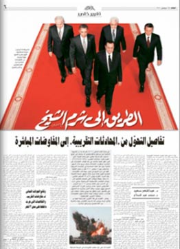 據(jù)英國廣播公司(BBC)9月16日報道,埃及全國發(fā)行量最大的《金字塔報》9月14日曾以《通往沙姆沙伊赫之路》為題,公布了一張中東和談領(lǐng)導(dǎo)人的照片。不為人知的是,這張照片是經(jīng)過修改的,將埃及總統(tǒng)穆巴拉克的位置由最右邊移至最前方,顯示出穆巴拉克走在所有領(lǐng)導(dǎo)人的最前面,暗示埃及才是和談的主導(dǎo)力量。
