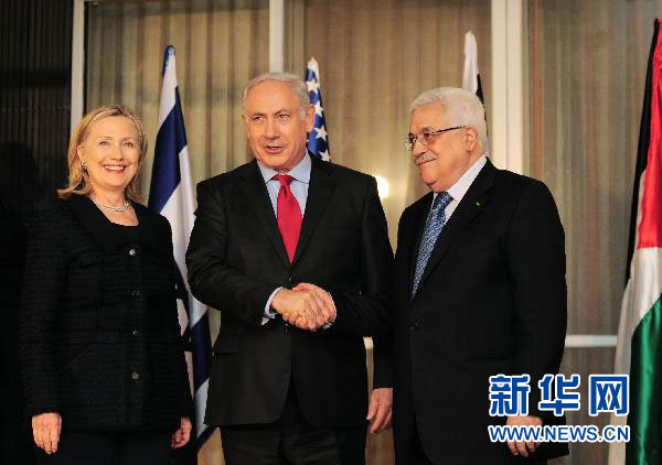 2010年9月15日,以色列總理內(nèi)塔尼亞胡(中)在耶路撒冷總理官邸與美國國務(wù)卿希拉里·克林頓(左)、巴勒斯坦民族權(quán)力機構(gòu)主席阿巴斯(右)會面。當日,巴勒斯坦和以色列領(lǐng)導人在耶路撒冷繼續(xù)舉行雙方第二輪直接和談,美國國務(wù)卿希拉里參加談判。(新華社記者尹棟遜攝)