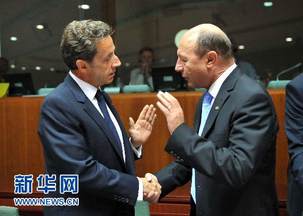 9月16日,在比利時(shí)首都布魯塞爾的歐盟總部,法國(guó)總統(tǒng)薩科齊與羅馬尼亞總統(tǒng)伯塞斯庫(kù)在首腦會(huì)議現(xiàn)場(chǎng)交談。當(dāng)天,歐盟首腦會(huì)議在布魯塞爾舉行。 新華社記者武巍攝