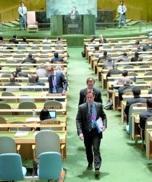 23日,紐約,當(dāng)內(nèi)賈德發(fā)表演講時(shí),兩名瑞典代表離席。