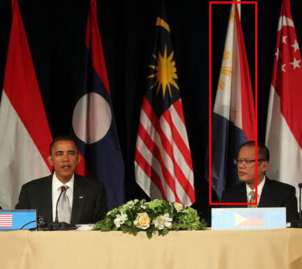 據(jù)24日拍攝的一張峰會現(xiàn)場照片顯示,當時懸掛于菲律賓總統(tǒng)阿基諾三世身后的菲律賓國旗系倒掛。不過,這張照片附帶的英文圖片說明并沒有指出這一錯誤。目前尚不清楚是何人何時指出的這一錯誤。