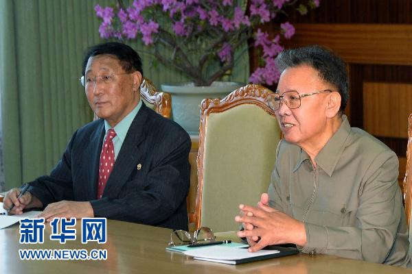 資料圖片:這是朝鮮最高領導人金正日(右)與2010年9月23日被任命為朝鮮內(nèi)閣副總理的姜錫柱在朝鮮首都平壤出席會議的資料照片(2009年8月4日攝)。 新華社/法新