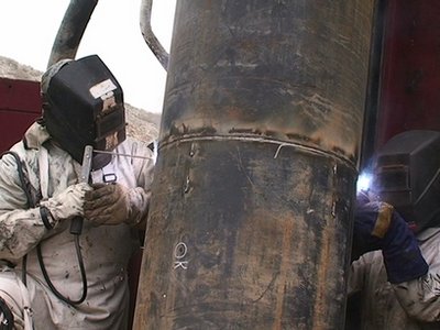 工人正在焊接營救被困礦工的設(shè)備