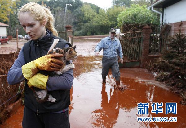 10月5日,在匈牙利首都布達佩斯以西150公里的一個村莊,當?shù)鼐用癖е恢回堧x開被有毒廢水覆蓋的地面。新華社/路透