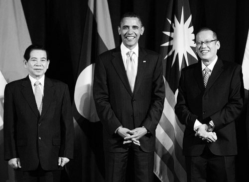 美國(guó)總統(tǒng)奧巴馬在9月舉行的東盟峰會(huì)上重提南海問題。圖為奧巴馬與東盟10 國(guó)領(lǐng)導(dǎo)人合影,左為越南國(guó)家主席阮明哲,右為菲律賓總統(tǒng)阿基諾三世。