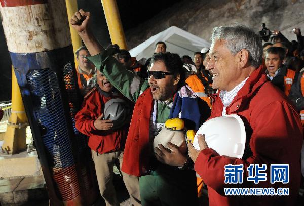 10月13日,在智利圣何塞銅礦,最后一名被困礦工路易斯·烏爾蘇亞(中)成功升井后同智利總統(tǒng)皮涅拉(右)一同慶祝。新華社發(fā)(智利政府提供)