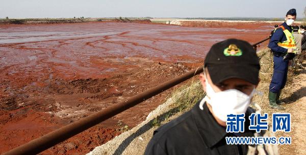 2010年10月10日,在匈牙利西部維斯普雷姆州的科隆達(dá)爾村,消防員在發(fā)生泄漏事故的鋁廠廢水池附近值勤。 新華社/路透