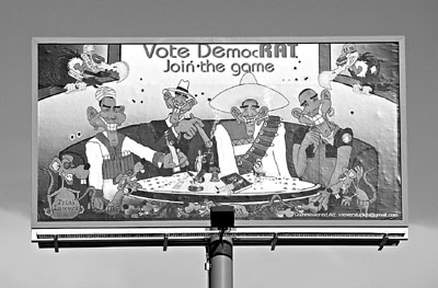 一幅位于美國科羅拉多州梅薩縣的大型選舉廣告牌惹來爭議。該廣告牌將奧巴馬描繪成伊斯蘭自殺式炸彈襲擊狂徒、同性戀者、抽雪茄的歹徒和墨西哥土匪,并畫上幾只身上寫上律師、美國國家稅務(wù)局(IRS)、國家環(huán)境保護(hù)署(EPA)和美聯(lián)儲(chǔ)的大老鼠,諷刺他們和奧巴馬蛇鼠一窩。