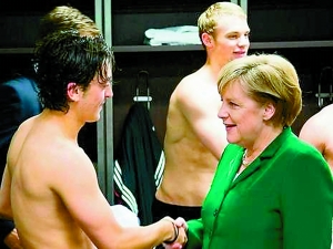 從照片中可以看出,更衣室里一片狼藉。不少球員赤裸上身,默克爾則穿著綠色外套,站在半裸的球員們面前與他們親切交談。德國中場厄齊爾事后說,那時大家雖然為贏球感到高興,但默克爾的到來確實(shí)令氣氛有點(diǎn)尷尬,衣衫不整的情況下與總理握手真令人感到不自在。