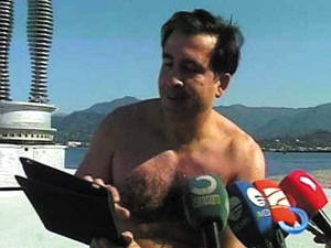 日前,格魯吉亞總統(tǒng)薩卡什維利在沿海城市巴統(tǒng)視察。在大海游泳過后,穿著泳褲的薩卡什維利一邊使用iPad一邊接受記者采訪。