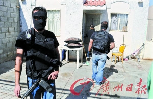 23日,全副武裝的墨西哥警察搜查槍擊事件發(fā)生的房子,試圖尋找歹徒的蛛絲馬跡。