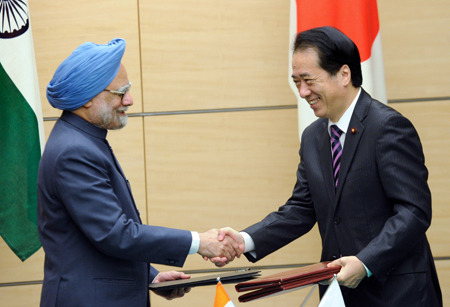 25日,東京,印度總理辛格(左)與日本首相菅直人在簽訂協(xié)議后握手。