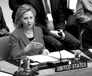10月26日,希拉里在聯(lián)合國安理會(huì)會(huì)議上講話。