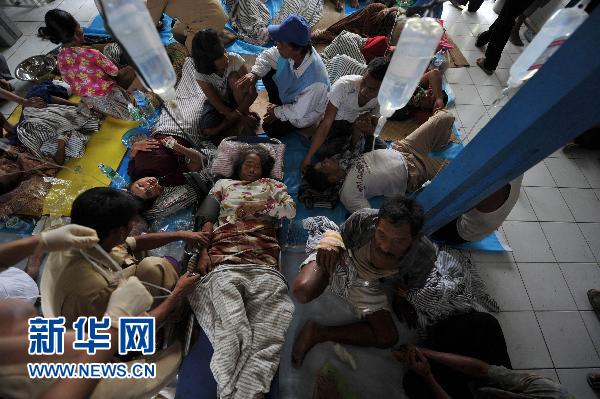 10月28日,在印度尼西亞西蘇門答臘省明打威群島的北巴蓋島一個小村莊,在海嘯中受傷的村民接受醫(yī)護(hù)人員治療。 新華社/法新