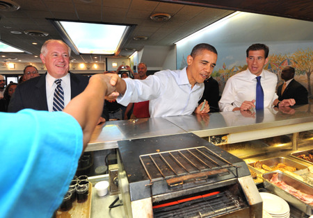 10月31日,芝加哥,奧巴馬(右二)到此為民主黨議員拉票,其間到一家餐廳吃早餐。