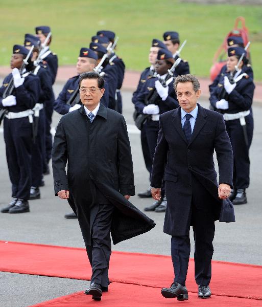 2010年11月4日 胡錦濤抵達(dá)巴黎開(kāi)始對(duì)法國(guó)進(jìn)行國(guó)事訪問(wèn) 11月4日,國(guó)家主席胡錦濤在巴黎奧利機(jī)場(chǎng)出席法國(guó)總統(tǒng)薩科齊舉行的隆重歡迎儀式。這是胡錦濤主席在薩科齊總統(tǒng)陪同下檢閱儀仗隊(duì)。新華社記者劉建生攝