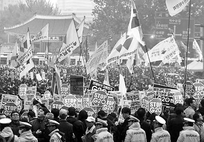 韓國首爾將于本周四、五舉行20國集團(G20)峰會,當?shù)?日有4萬人在市政廳附近的首爾廣場示威,反對全球化及美韓自由貿(mào)易協(xié)定等,逾8000名防暴警察在場戒備。據(jù)香港《文匯報》報道,數(shù)百名群情洶涌的示威者嘗試游行到市中心,與防暴警察沖突,警方發(fā)射胡椒噴霧阻止人群前進。
