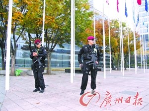 記者一到仁川國際機場,就能明顯感受到G20的氛圍。從仁川機場到首爾市區(qū),峰會的官方會徽青紗燈籠標志到處可見。在G20首爾峰會的主會場COEX會展中心,全副武裝的特警在會場周圍24小時巡邏。