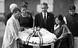 11月8日,新德里,奧巴馬與妻子在甘地紀念碑前參加敬獻花圈儀式。