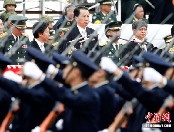資料圖片:當(dāng)?shù)貢r間10月24日,日本自衛(wèi)隊在東京以北的朝霞基地舉行閱兵儀式。日本首相菅直人檢閱了這次自衛(wèi)隊的分列式。
