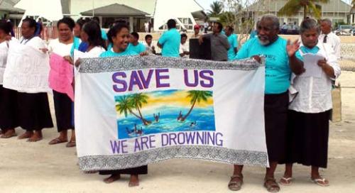 基里巴斯居民10日在國會外手持旗幟喊“救命”