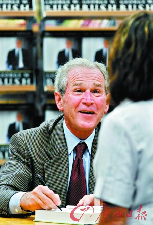 布什9日在達(dá)拉斯居所附近的一家書店里簽名售書。