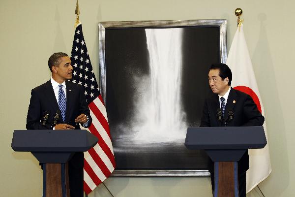 11月13日,在日本橫濱,日本首相菅直人(右)和美國總統(tǒng)奧巴馬在雙邊會(huì)談后會(huì)見記者。當(dāng)日,日本首相菅直人和美國總統(tǒng)奧巴馬在橫濱舉行雙邊會(huì)談。 新華社發(fā)