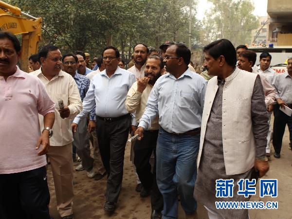 11月16日,一些印度官員在首都新德里的居民樓坍塌現(xiàn)場視察。