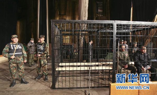 11月17日,吉爾吉斯斯坦前國防部長卡利耶夫(前右一)等人在比什凱克出庭。新華社/路透