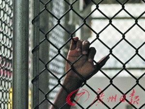 一名關(guān)塔那摩囚徒手拉著鐵絲網(wǎng)。(資料圖片)