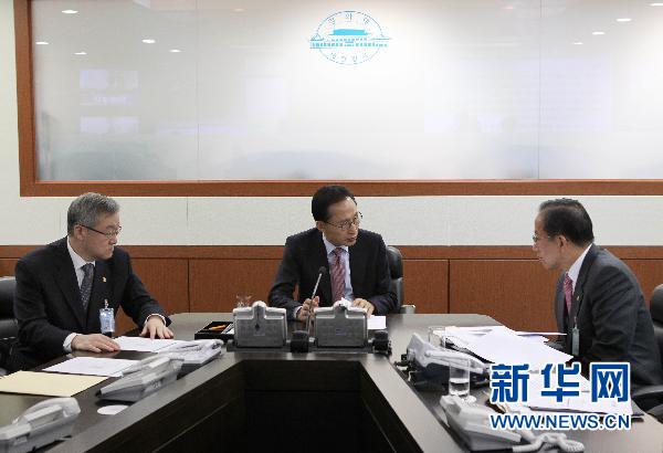 11月23日,在位于韓國首都首爾的韓國總統(tǒng)府青瓦臺,韓國總統(tǒng)李明博(中)在緊急安保長官會議上與韓國國防部長官金泰榮(右一)交談。