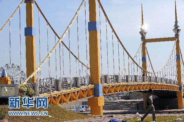11月24日,在柬埔寨金邊市,一名警察從發(fā)生踩踏慘案的鉆石島橋邊走過。柬埔寨國家警察副總監(jiān)和金邊踩踏事故調(diào)查特別委員會(huì)副主席索帕當(dāng)天說,22日發(fā)生的鉆石島橋踩踏慘案是因橋身晃動(dòng)引起恐慌造成的。新華社/法新