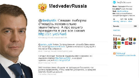 梅德韋杰夫今年6月訪問(wèn)美國(guó)期間啟用微博,迄今已擁有12.7萬(wàn)名粉絲,英文版微博粉絲超過(guò)5.4萬(wàn)名。