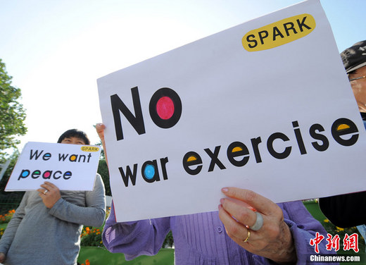 韓美反潛聯(lián)合軍事演習(xí)27日在韓國西部海域(黃海)拉開帷幕。當(dāng)日,一些韓國反戰(zhàn)人士在國防部門前集會抗議美韓聯(lián)合軍演。